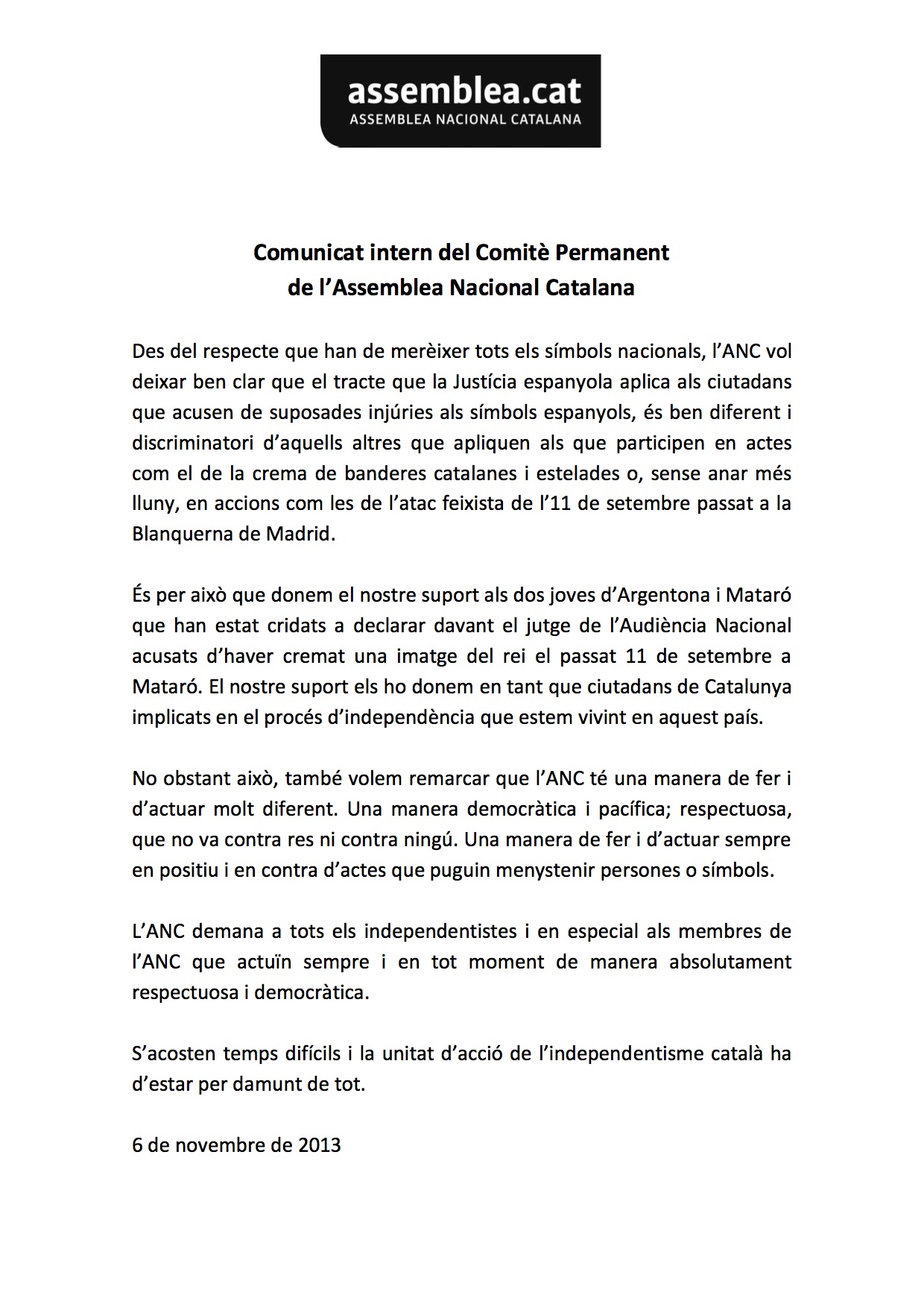 Davant la notícia de l’abdicació del Rei d’Espanya, Joan Carles I i les diferent s crides a les concentracions d’avui al vespre, des del Comitè Permanent de l’ANC volem manifestar el següent: