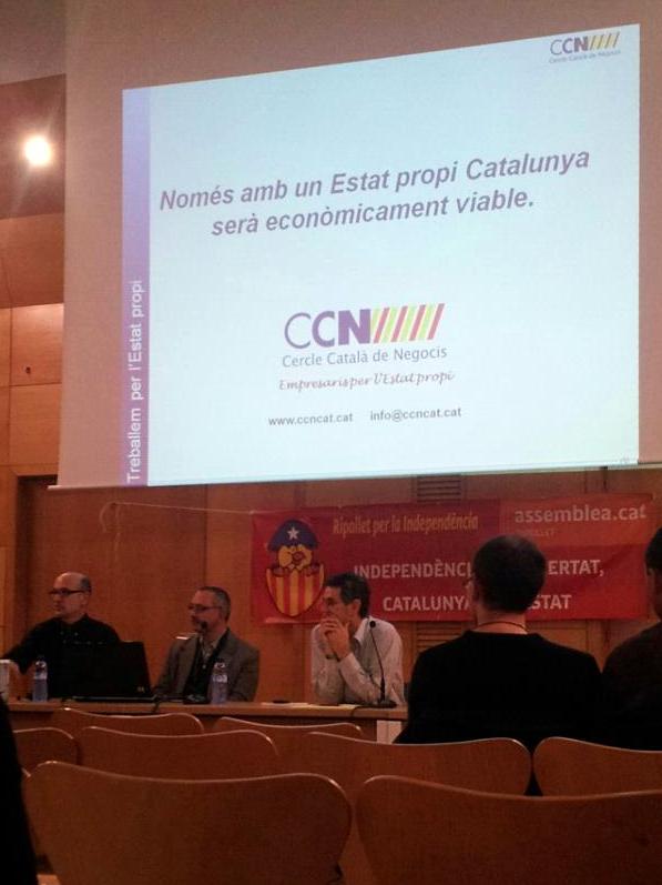 Ripollet per la Independència va organitzar una Xerrada-Col·loqui el passat divendres 23 de novembre a la sala d’actes del centre cultural amb el Centre Català de Negocis (CCN), una associació d’empresaris, directius i professionals desvinculat de qualsevol opció política que, per tal de garantir el futur del teixit empresarial català, volen disposar d’un Estat propi. Com a ponents van participar en Jordi Canals, coordinador de Ripollet per la independència, i en Josep Conejos i en Francesc Gimenez, com a membres del CCN.