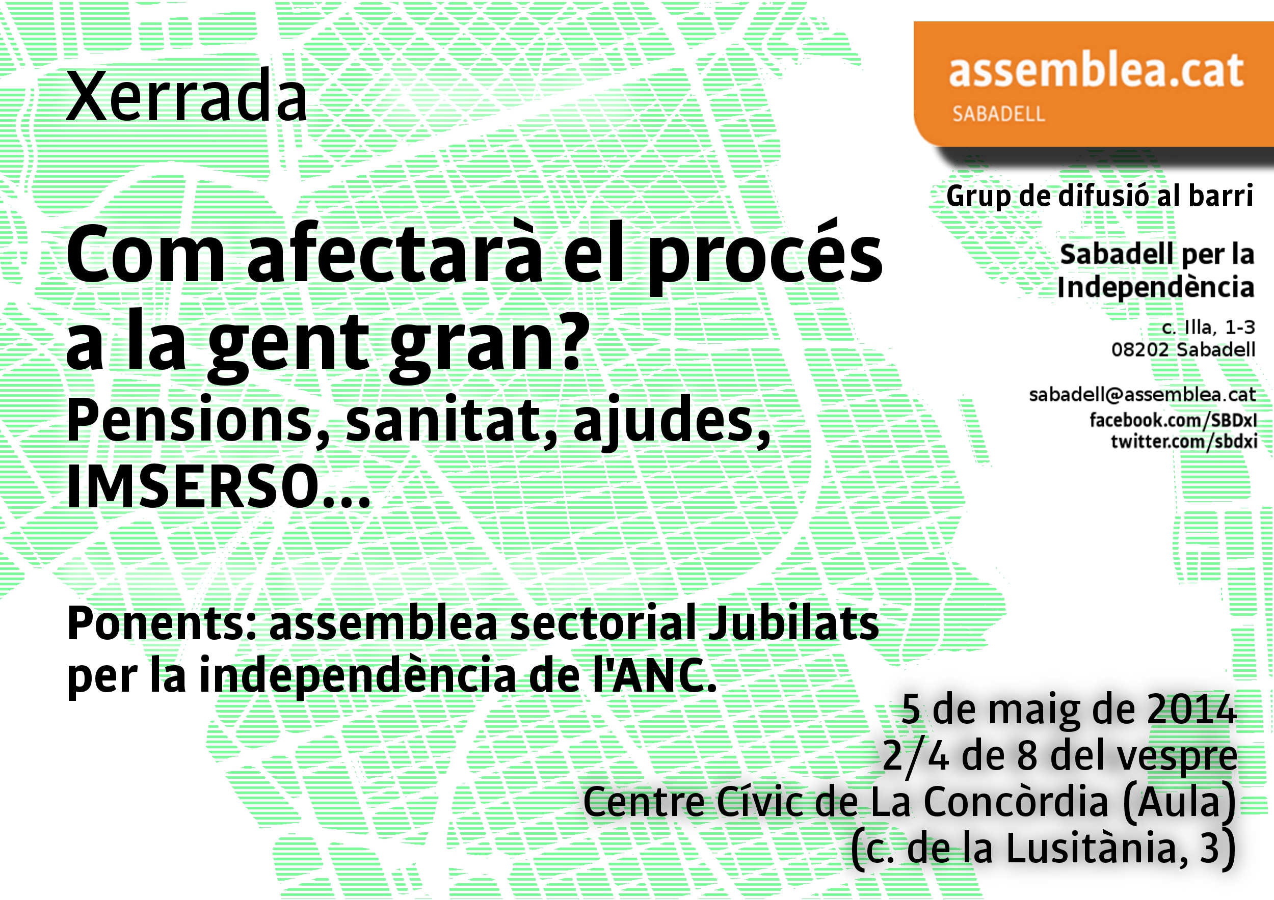 Us convidem a la xerrada Com afectarà el procés a la gent gran? Pensions, sanitat, ajudes, IMSERSO… que farem el dilluns, 5 de maig, aCentre Cívic de la Concòrdia (carrer de Lusitània, 3, Sabadell) a 2/4 de 8 del vespre.