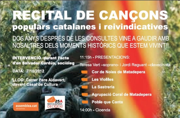 Dia 7 de setembre a les 7 de la tarda: Cercavila per Terrassa. Des de la Plaça de l’Aigua (s’esperarà als companys de Matadepera) fins al Raval de Montserrat on es llegirà el manifest per part de l’escriptora Sílvia Alcàntara, l’actriu Marissa Josa i l’actor Jaume Bernet. Abans intervindrà en Salvador Cardús. Més informació …