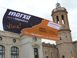 La pancarta que anuncia les marxes de Sabadell, Terrassa i Barcelona
