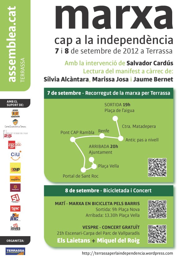 Dia 7 de setembre a les 7 de la tarda: Cercavila per Terrassa. Des de la Plaça de l’Aigua (s’esperarà als companys de Matadepera) fins al Raval de Montserrat on es llegirà el manifest per part de l’escriptora Sílvia Alcàntara, l’actriu Marissa Josa i l’actor Jaume Bernet. Abans intervindrà en Salvador Cardús. Més informació …