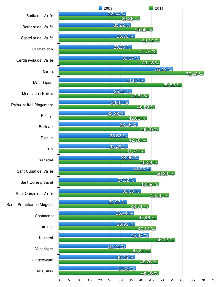 En alguns dels pobles petits i mitjans de la comarca el grau de mobilització destaca especialment. Les persones organitzades per anar a la Via representen el 16% de la població de Bellaterra, el 13% de Matadepera, el 23% de Rellinars, el 12% de Sant Llorenç Savall o el 16% d’Ullastrell. També destaquen els percentatges de les ciutats mitjanes com Castellbisbal 4%, Sant Quirze del Vallès 6%, Sentmenat 6%, Vacarisses 6% o Viladecavalls 8%.