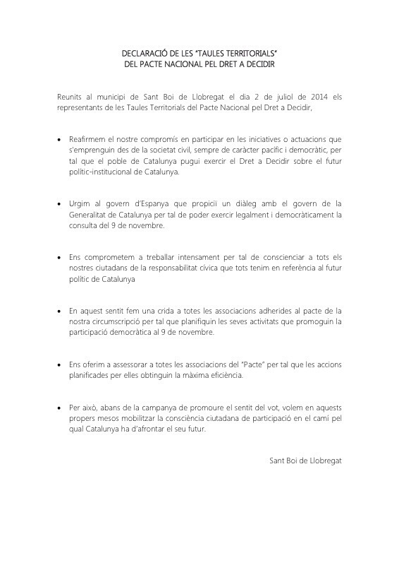 La trobada nacional de “Taules territorials” que ha propiciat el Pacte Nacional pel Dret a Decidir aquesta tarda a Sant Boi ha comptat amb la presència de representats del Vallès Occidental. En concret Rubí, Sabadell, Sant Cugat, Sant Quirze i Terrassa han format part de les que han pogut assistir a l’acte. Moltes de tot Catalunya han excusat la seva presència.