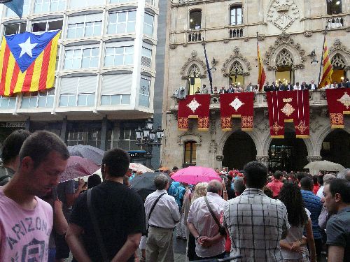 Un any més tornem a penjar l’estelada gegant al Raval de Montserrat durant la diada castellera de la Festa Major de Terrassa. Aquesta vegada, però, l’estelada ha hagut de viatjar durant la nit des de Lleida, on va estar penjada fins al final del concert commemoratiu de l’inici de La Marxa cap a la independència. Al balcó de l’Ajuntament hi havia, per exemple, l’alcalde Pere Navarro i el bisbe de Terrassa.
