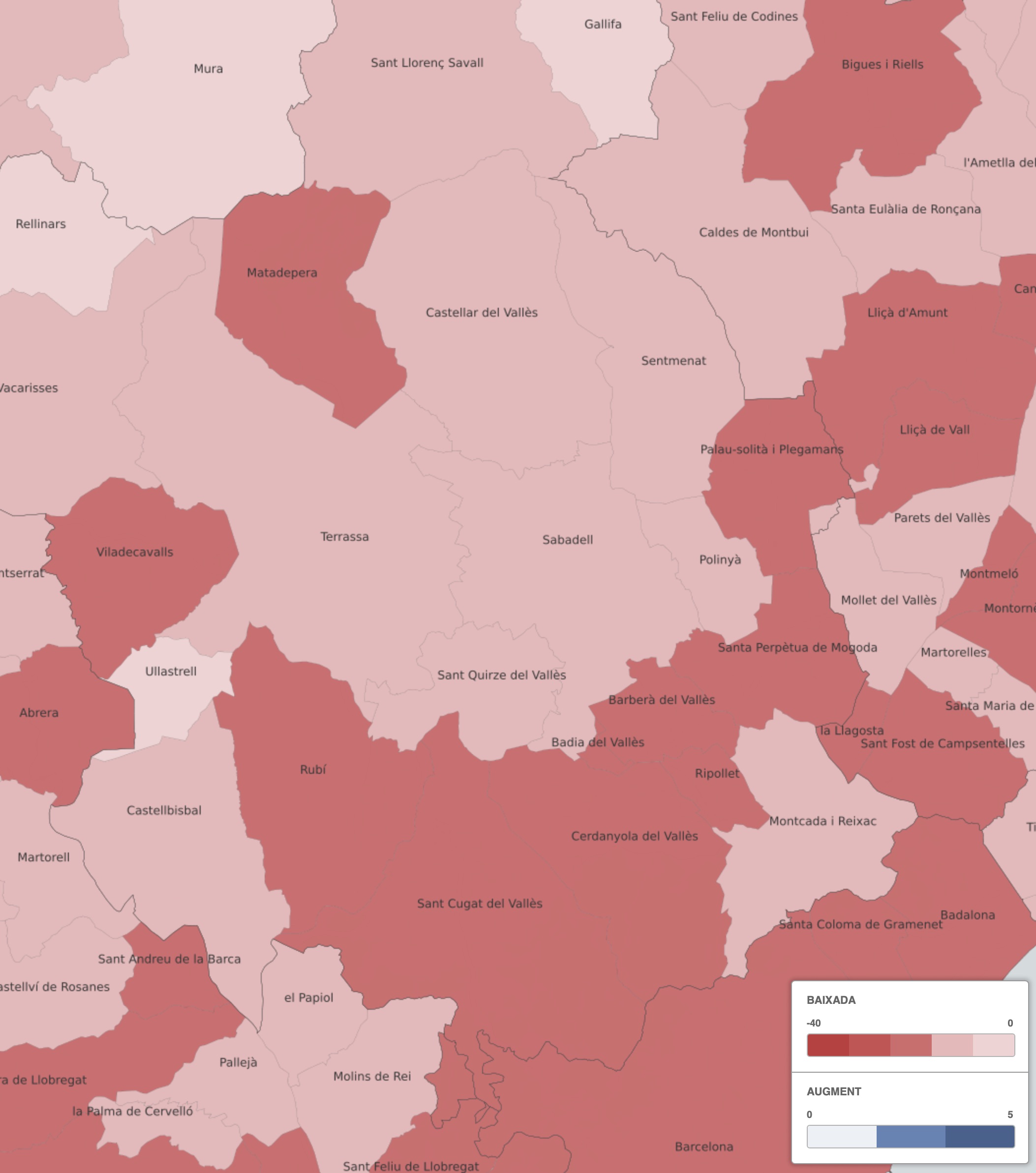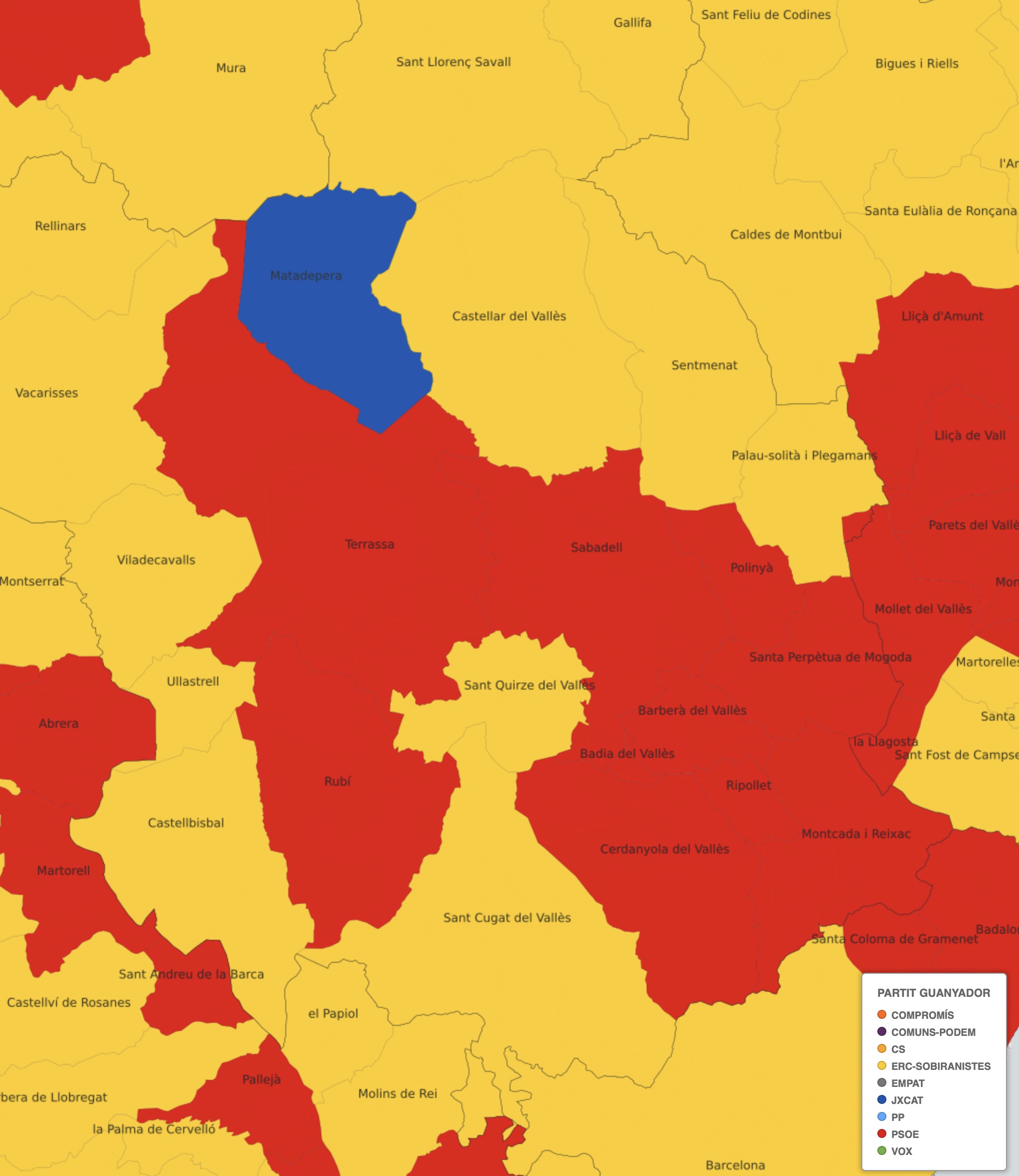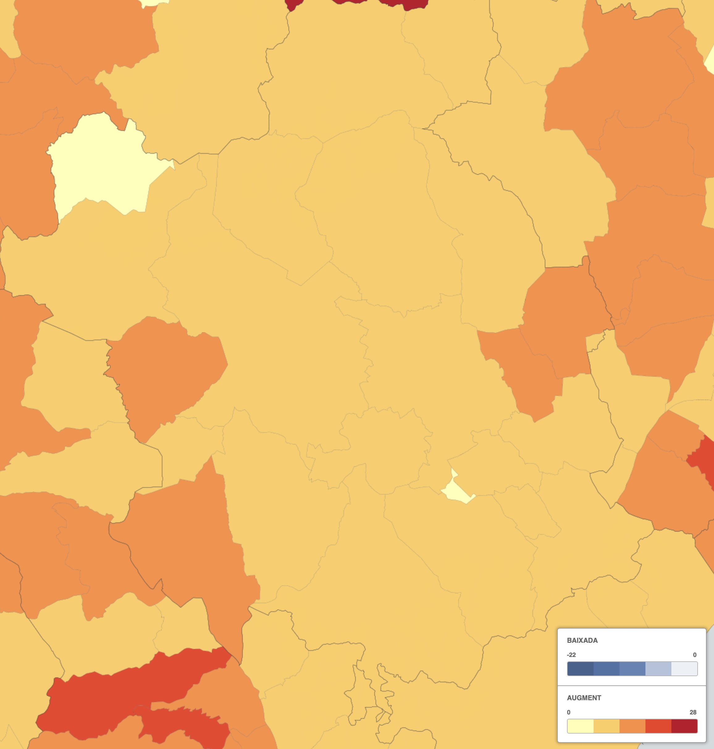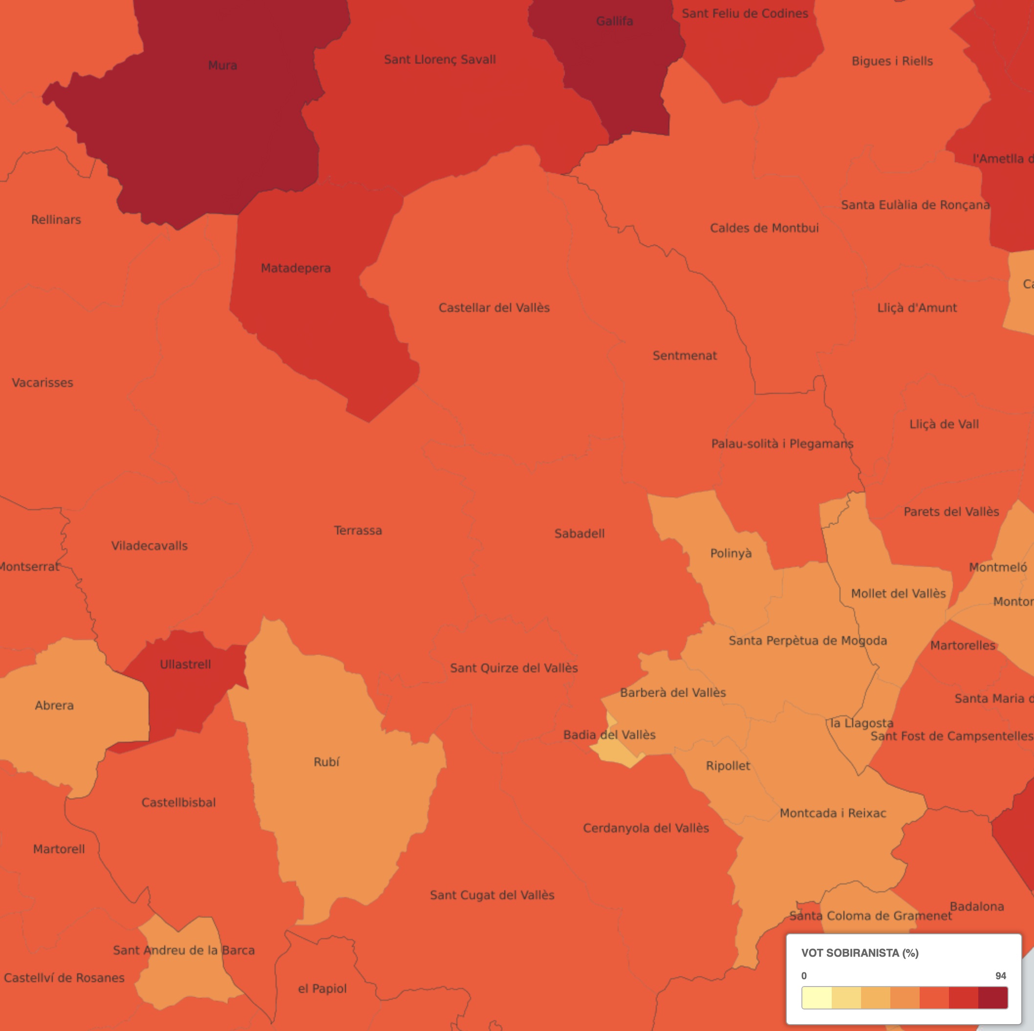 Aquest mapa mostra el percentatge de vot de les formacions independentistes: ERC, Junts per Catalunya i Front Republicà.